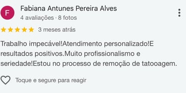 As sessoes variam de acordo com o tipo de tatuagem, profundidade do pigemnto, localizacao e quantidade de tinta. Trabalhamos com estimativas de 4 a 10 sessoes. Frisando que o processo de remocao exige cuidado e o meu comprometimento e em sempre zelar por uma pele integra do inicio ao fim do procedimento e indispensavel. O meu empenho sera em realizar sua remocao de forma mais rapida e segura!